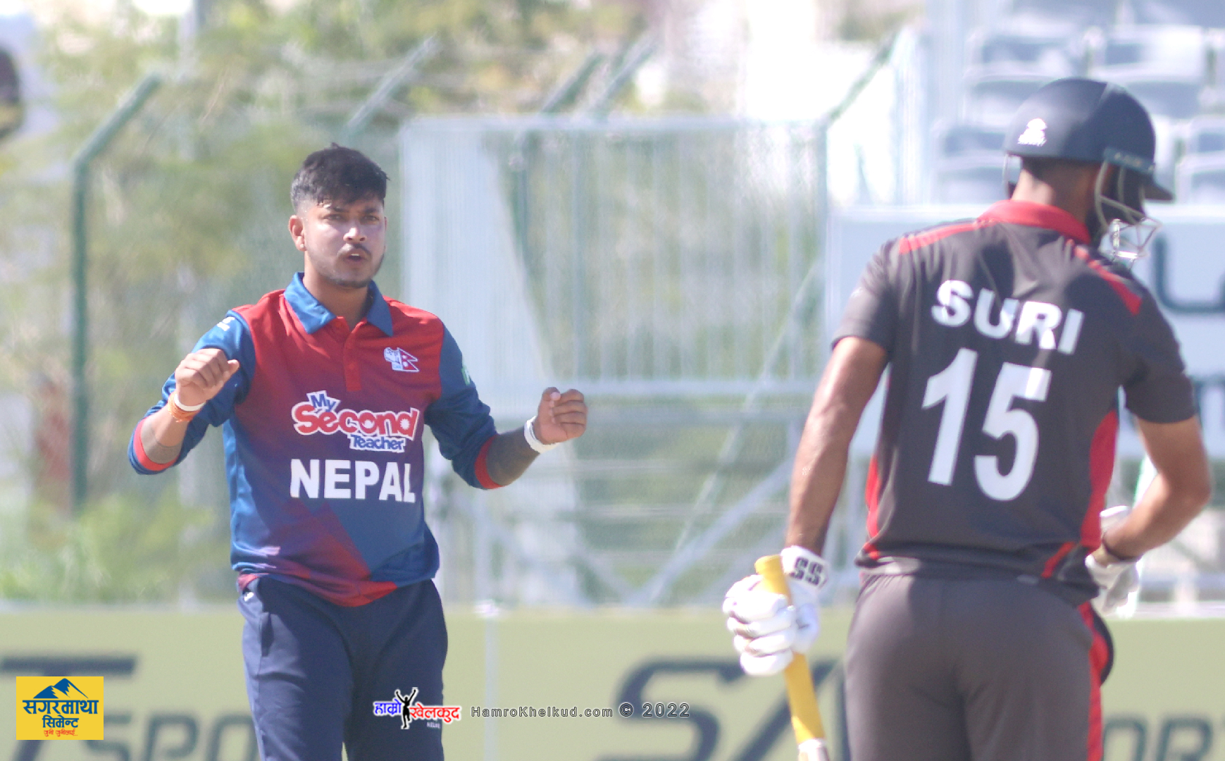 ओमानको मस्कटमा रहेको अल अमरेत क्रिकेट मैदानमा टस जितेर नेपालले युएईलाई पहिला ब्याटिङको निम्तो दिएको थियो । युएईले निर्धारित २० ओभरमा ३ विकेट गुमाउँदै १ सय ९२ रन बनाएको थियो । युएईका ओपनर चिराग सुरीले ५३ बलमा ५ चौका र ५ छक्कासहित ८४ रनको अविजित इनिङ खेले । रोहन मुस्तफाले ३५ बलमा ५ चौका र २ छक्कासहित ४९ रन बनाए । नेपालका सन्दीप लामिछाने, साहब आलम र आरिफ शेखले १–१ विकेट लिए ।