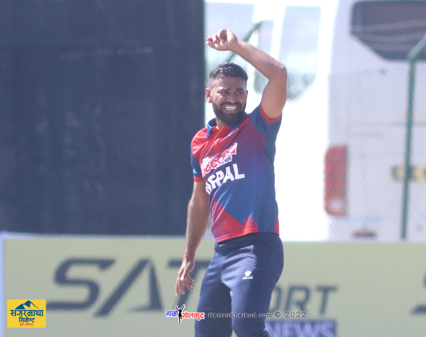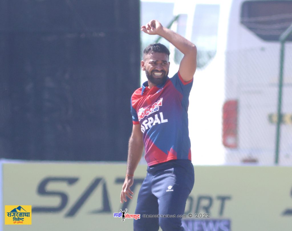तेस्रो बलमा उनी क्याच आउट भए । समग्रमा त्यस ओभरमा २२ रन जोडेको थियो । नेपालले १० ओभर स्पिनरलाई गराउँदा ८७ रन खर्चेर १ विकेट लिएका छन् । १० मध्य ४ ओभरमा सन्दीपले २३ रन खर्चेर १ विकेट लिएका थिए । बाँकी तीन स्पिनरले २–२ ओभर बलिङ गर्दा कुल ६३ रन खर्चिदा कुनै पनि विकेट लिन सकेनन् । सन्दीपले नवौं ओभरमा २ र ११ औं ओभरमा ४ रन मात्र खर्चिदै दबाब बनाएका थिए । तर १२ औं ओभरमा शरदले ११ रन खर्चिदै पुन हाबी हुन दिए । स्पिनरको कमजोर प्रदर्शनसँगै तीव्र गतिका बलर दबाबमा परे ।