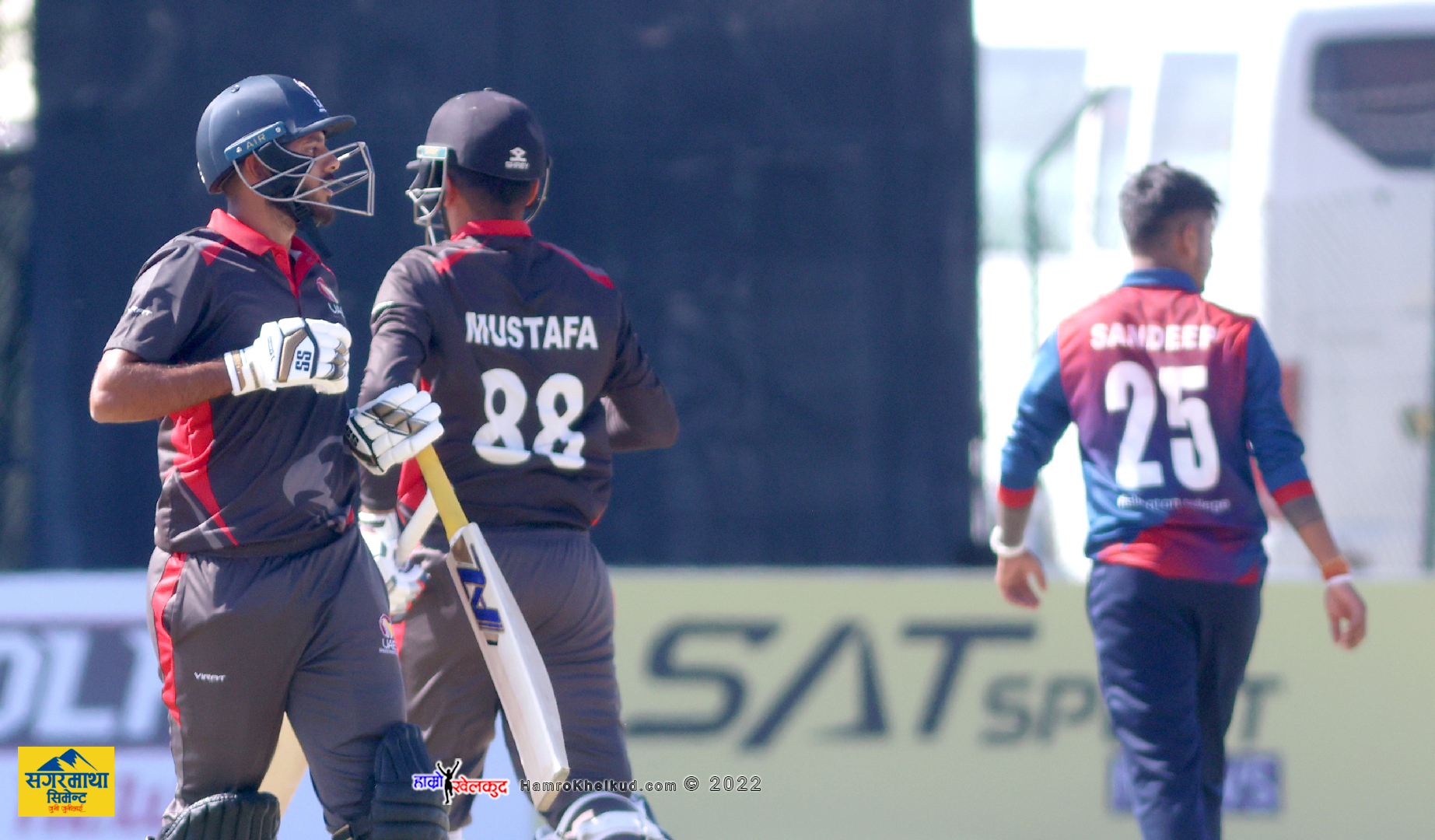 युएईलाई जिताउन स्पिनर रोहन मुस्तफा र ओपनर चिराग सुरीले उत्कृष्ट साझेदारी गरे । पहिलो विकेट युएईले २३ रनमा गुमाएपनि दोस्रो विकेटका लागि मुस्तफा र सुरीले ९७ रनको उत्कृष्ट साझेदारी गरेका थिए । जुन साझेदारी युएईको जितको आधार बनेको थियो । उक्त साझेदारीले विना दबाब खेल्ने वातावरण बनेको थियो । दायाँ हाते सुरी र बायाँ हाते मुस्तफाले लगातार आक्रामक ब्याटिङका साथ नेपाली बलरलाई दबाबमा राखेका थिए ।