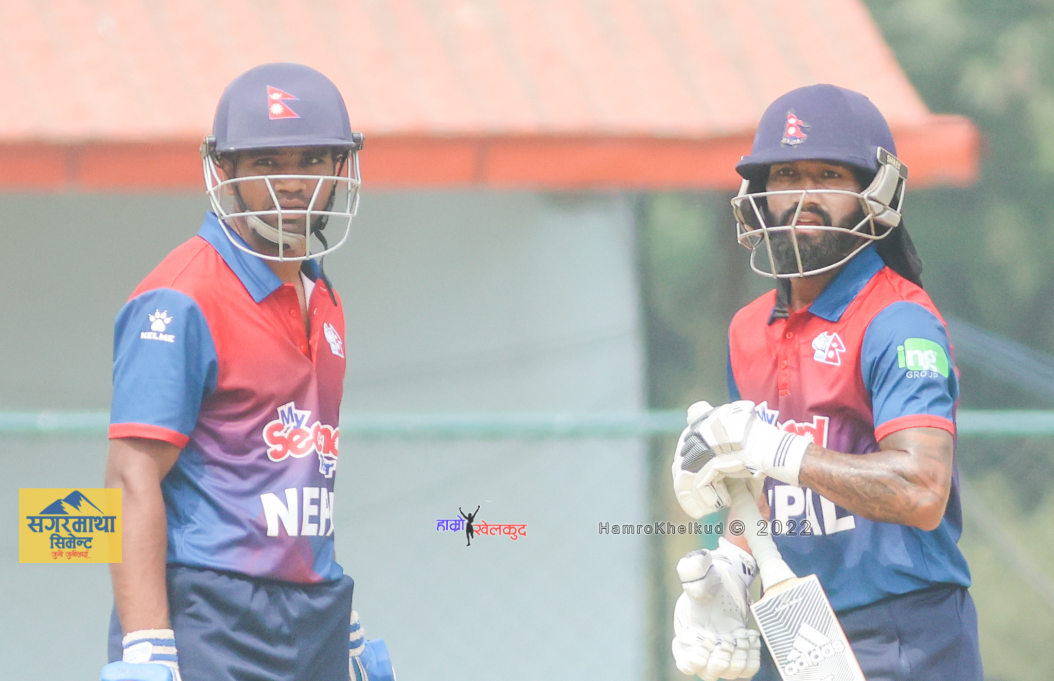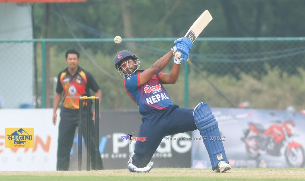 टियु क्रिकेट मैदानमा टस हारेर पहिला ब्याटिङ थालेको नेपालले निर्धारित २० ओभरमा ७ विकेट गुमाउँदै २ सय ३ रन बनायो । नेपालका दीपेन्द्रसिंह ऐरीले ३३ बलमा ३ चौका र ४ छक्कासहित सर्वाधिक ६६ रनको योगदान दिए । डेब्यू खेल खेलेका आदिल अन्सारीले ११ बलमा १ चौका र ३ छक्कासहित ३३ रनको इनिङ खेले ।
