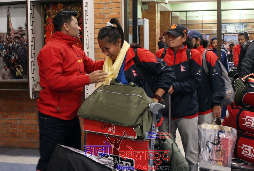 टोलीलाई स्वागत गर्न पुरुष राष्ट्रिय क्रिकेट टोलीका प्रशिक्षक जगत टमाटा, भावना घिमिरे, छुम्बी लामा, युवराज श्रेष्ठ लगायत अन्य व्यक्तिहरु विमानस्थल आइपुगेका थिए।