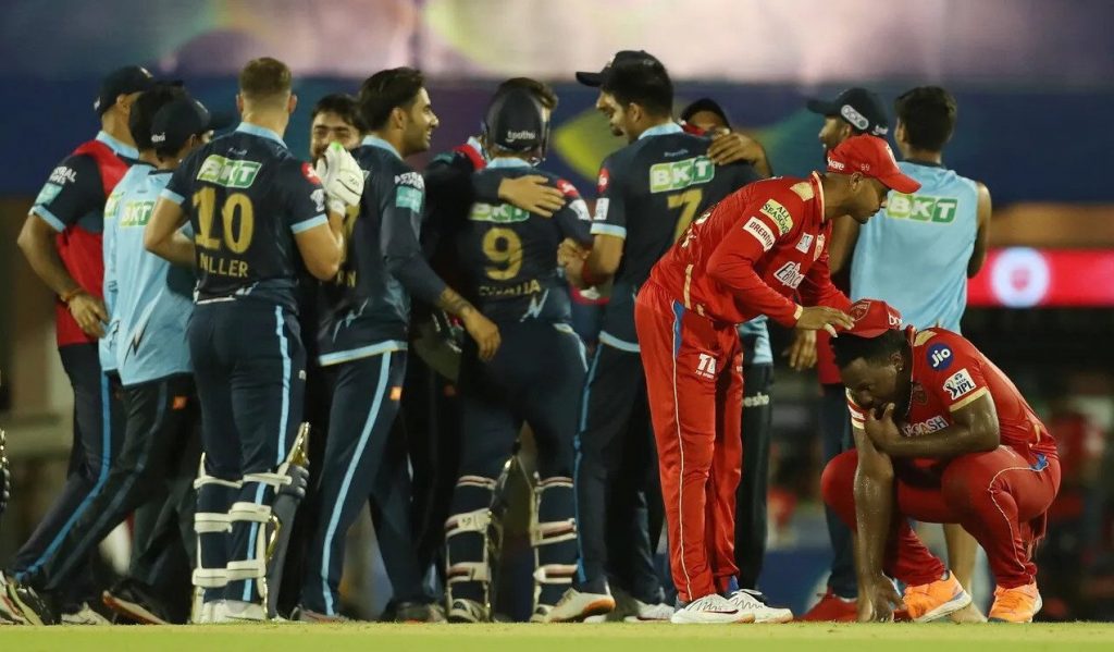 गुजरातलाई अन्तिम १८ बलमा जितको लागि ३७ रन आवश्यक पर्दा हातमा ८ विकेट थियो । १८ औं ओभरमा अर्शदीप सिंहले ५ रन मात्र खर्चेपछि अन्तिम १२ बलमा ३२ रन चाहिँएको थियो । १९ औं ओभरमा कागिसो रबाडाले दुई चौकासहित १ विकेट लिँदै १३ रन खर्चिए । राहुल ट्वाटिया ३ बलमा २ छक्कासहित १३ रनमा अविजित रहे । कागिसो रबाडाले ४ ओभरमा ३५ रन खर्चेर २ विकेट लिए । राहुल चाहरको नाममा १ विकेट रह्यो ।