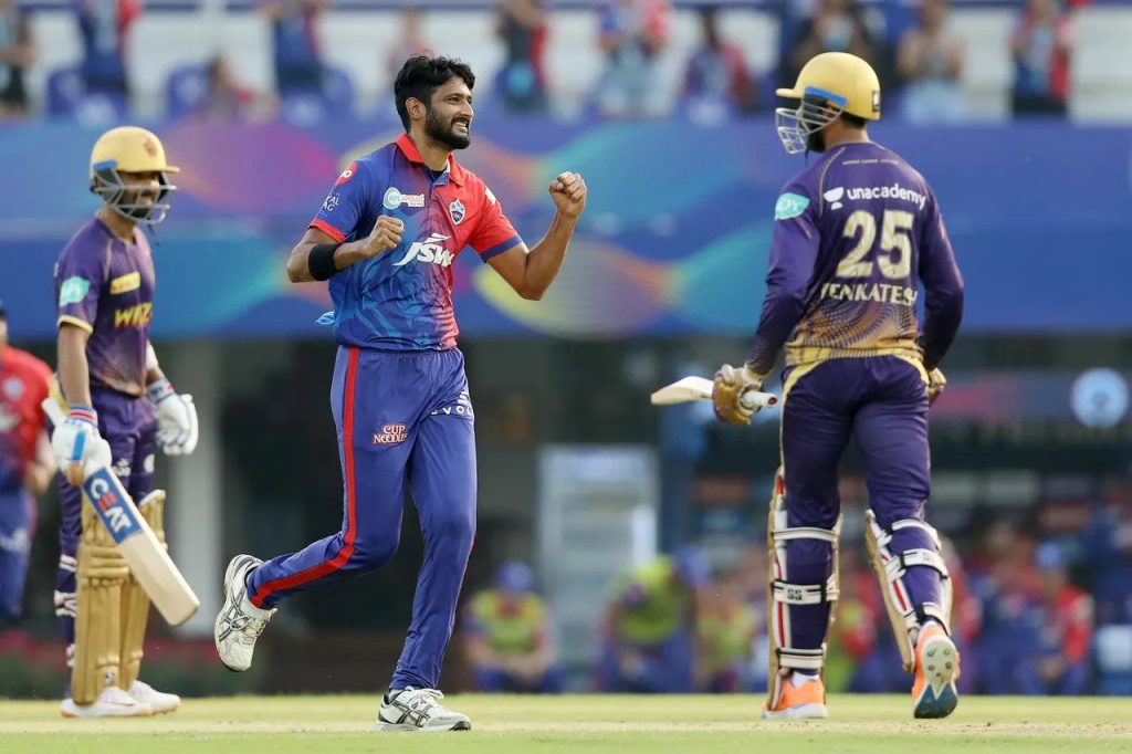 दिल्लीलाई तीव्र गतिका बलर खलिल अहमदले उत्कृष्ट सुरुवात दिलाएका थिए । खलिलले ओपनर अजिक्या रहाणेलाई ८ र वेंकटेश ऐरलाई १८ रनमा क्याच गराउँदै ४.४ ओभरमा ३८–२ को अवस्थामा पुर्याए । त्यसपछि नितिश राणाले २० बलमा ३ छक्कासहित ३० रन बनाउँदै आउट भए ।