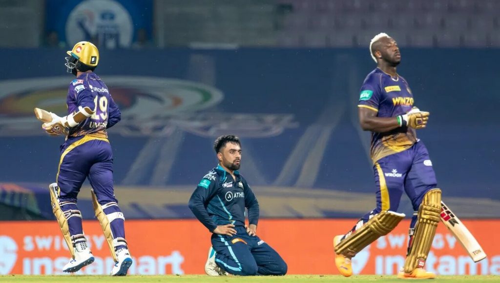 रसेलले ब्यक्तिगत ४ रनमा जीवनदान पाएका थिए । दयालको १३ औं ओभरको तेस्रो बलमा बाउन्समा एज लागेर फाइन लेगमा क्याच भएपनि नो बलका कारण रसेलले जीवनदान पाएका थिए । तीव्र गतिका बलर मोहम्मद शामीले पहिलो ओभरको चौथो बलमा साम बिलिंग्सलाई ४ रनमा ऋद्धिमान शाहबाट क्याच गराए । उनी टप एज लागेर क्याच भए । शामीले नै फाइनल लेगमा लोकी फर्गुसनबाट सुनिल नारायणलाई ५ रनमा क्याच गराए ।