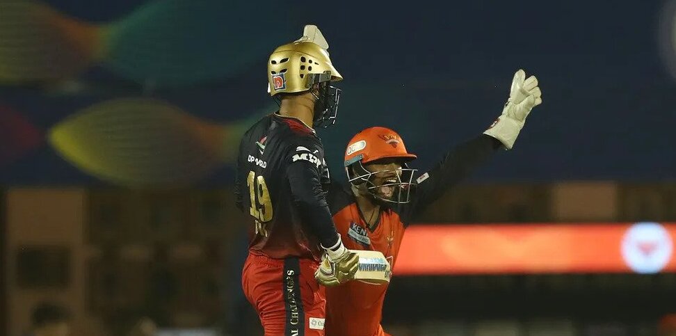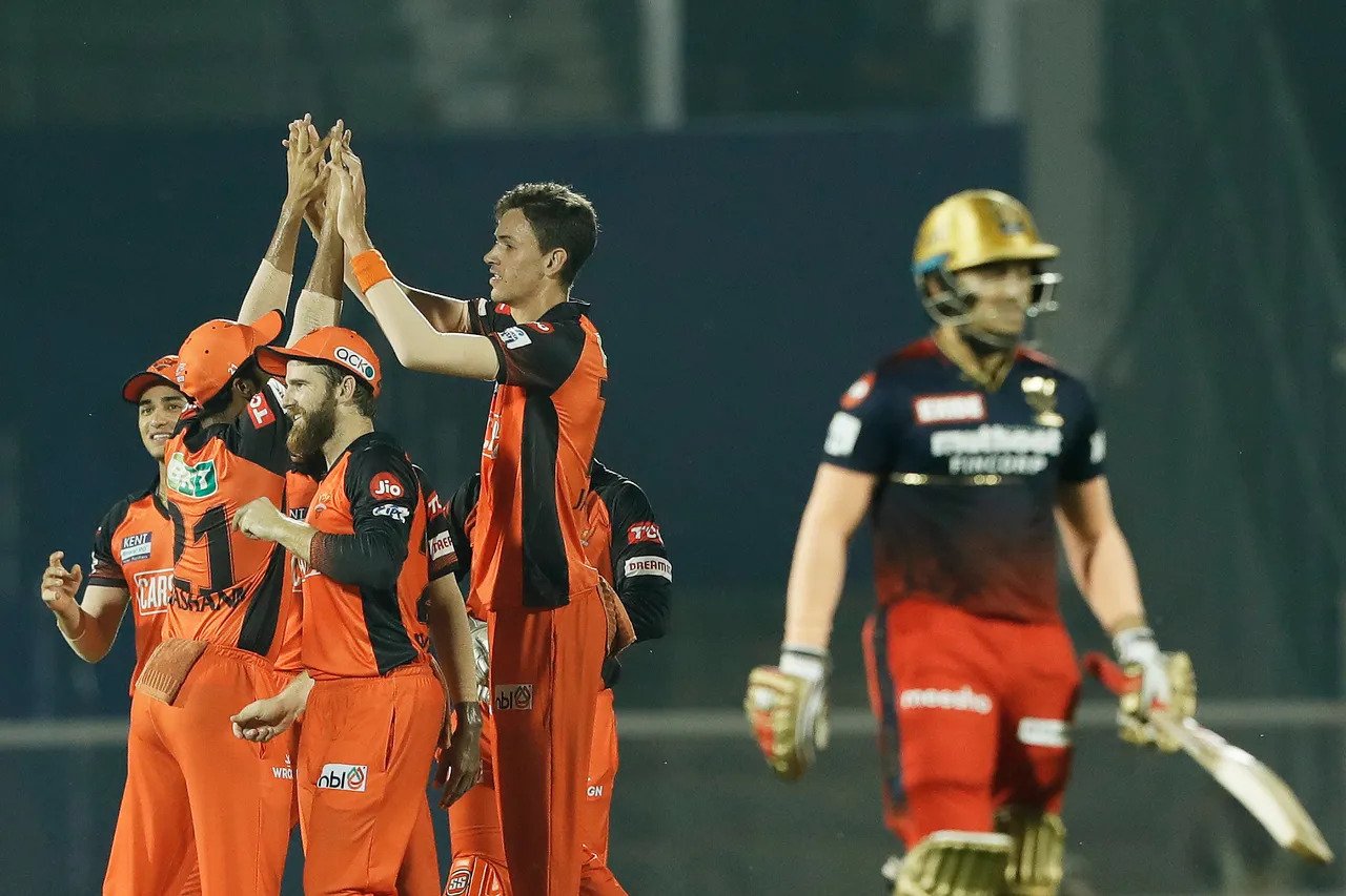 टि नटराजनले हर्षल पटेललाई ४ रनमा बोल्ड गर्दा ५५–८ को अवस्थामा पुगेको थियो । हैदराबादका मार्को ज्यानसनले ४ ओभरमा २५ रन खर्चेर ३ विकेट लिए । टि नटराजनले ३ ओभरमा १० रन खर्चेर ३ विकेट लिए । जगदीश सुचिथले ३ ओभरमा १२ रन खर्चेर २ विकेट लिए । भुवनेश्वर कुमारले र उमरन मलिकले १–१ विकेट लिए ।