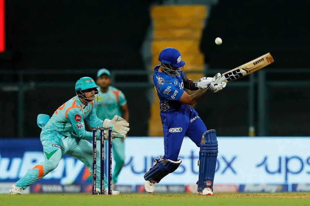 आइपिएलमा पहिलो पटक बलिङ गरेका युवा ब्याटर आयुष बदोनीको १२ औं ओभरको दोस्रो बलमा सूर्य कुमार यादव एक्स्ट्रा कभरमा लोकेश राहुलबाट ७ रनमा क्याच भएपछि ६७–४ को अवस्थामा पुगेको थियो ।