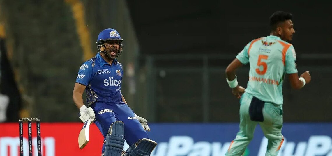डेवाल्ड ब्रेभिस नवौं ओभरको तेस्रो बलमा थर्ड म्यानमा दुश्मन्था चामिराबाट क्याच गराए । मोहसिन खानको बलमा प्वाइन्टमा खेल्न चाहेपनि थर्डम्यानमा क्याच हुन पुगे । स्पिनर क्रुनाल पान्ड्याको दशौं ओभरको चौथो बलमा ठूलो सट खेल्ने धुनमा रोहित एज लागेर थर्डम्यानमा कृष्णाप्पा गौथमबाट क्याच भएपछि मुम्बईको दबाबमा परेको थियो ।