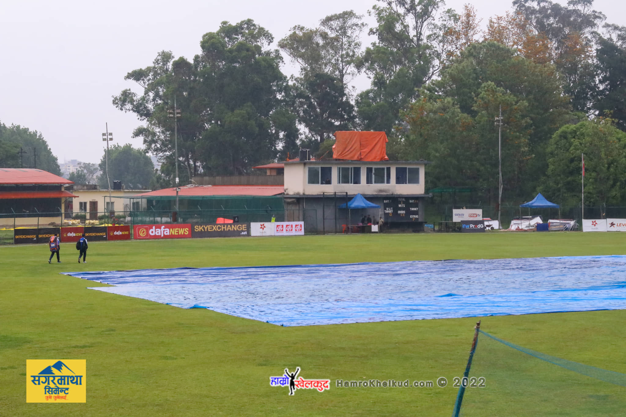 दुबै टोलीका खेलाडी पेभेलिएन बक्सम छन् । वर्षा लगातार जारी छ । बर्षा नरोकिएको खण्डमा भने आज खेल हुने सम्भावना कम हुन्छ । समयमै वर्षा रोकिएमा ओभर घटाएर खेल हुनेछ ।