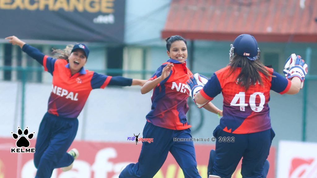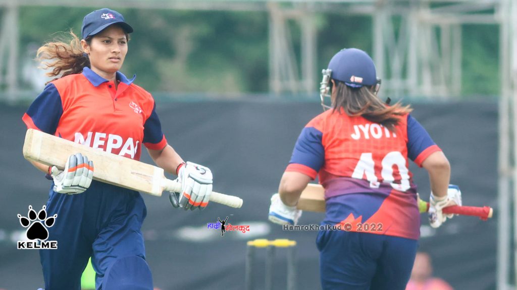 नेपालका दुबै ओपनर रन आउट भए । पहिलो विकेटका लागि ओपनर ज्योति पाण्डे र विन्दु रावलले ४.२ ओभरमा २० रनको साझेदारी गरेका थिए । रावल २३ बलमा २ चौकासहित १२ रनमा रन आउट भइन् । ज्योति ७ बलमा ६ रन बनाउँदै रन आउट भइन् ।