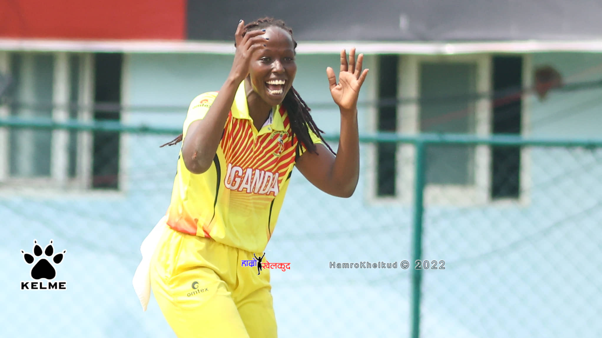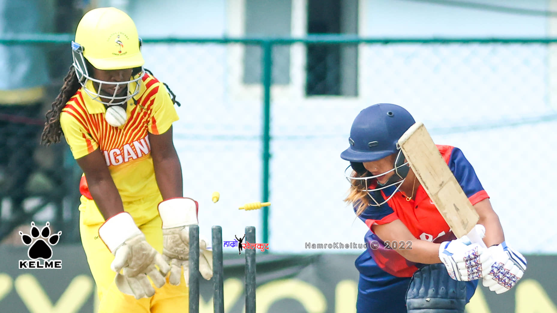 अप्सरी बेगम ४ र डली भट्ट ६ रनमा आउट भए । अस्मिना कर्माचार्य र कविता कुँवरले ६(६ रन जोडे । युगान्डाकी कोन्सी कोन्सी एविकोले ४ ओभरमा १३ रन खर्चेर ३ विकेट लिइन् । सारा एकिटेंगले ४ ओभरमा १ मेडनसहित १० रन खर्चेर २ विकेट लिइन् ।