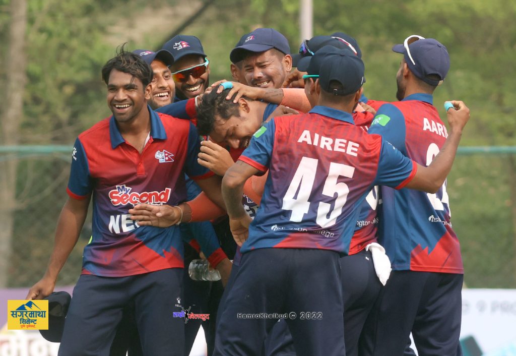 सन्दीप लामिछाने (कप्तान), आसिफ शेख (विकेटकिपर), कुशल भुर्तेल, रोहित पौडेल, दीपेन्द्रसिंह ऐरी, आरिफ शेख, विनोद भण्डारी (विकेटकिपर), सुनिल धमला, देव खनाल, आदिल अन्सारी, करण केसी, सोमपाल कामी, विक्रम सोब, किशोर महतो र सागर ढकाल ।