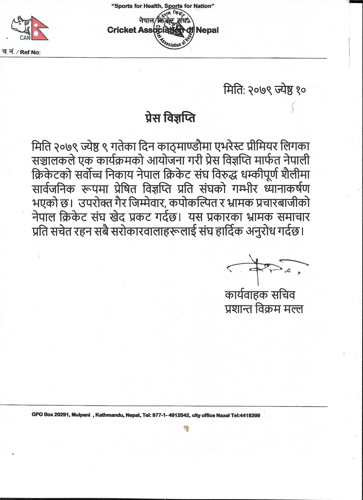 काठमाडौं (हाम्रो खेलकुद) – नेपाल क्रिकेट संघ (क्यान) ले फ्रेन्चाईज लिग एभरेष्ट प्रिमियर लिग (इपिएल) को प्रेस विज्ञप्ती धम्कीपूर्ण रहेको बताएको छ ।