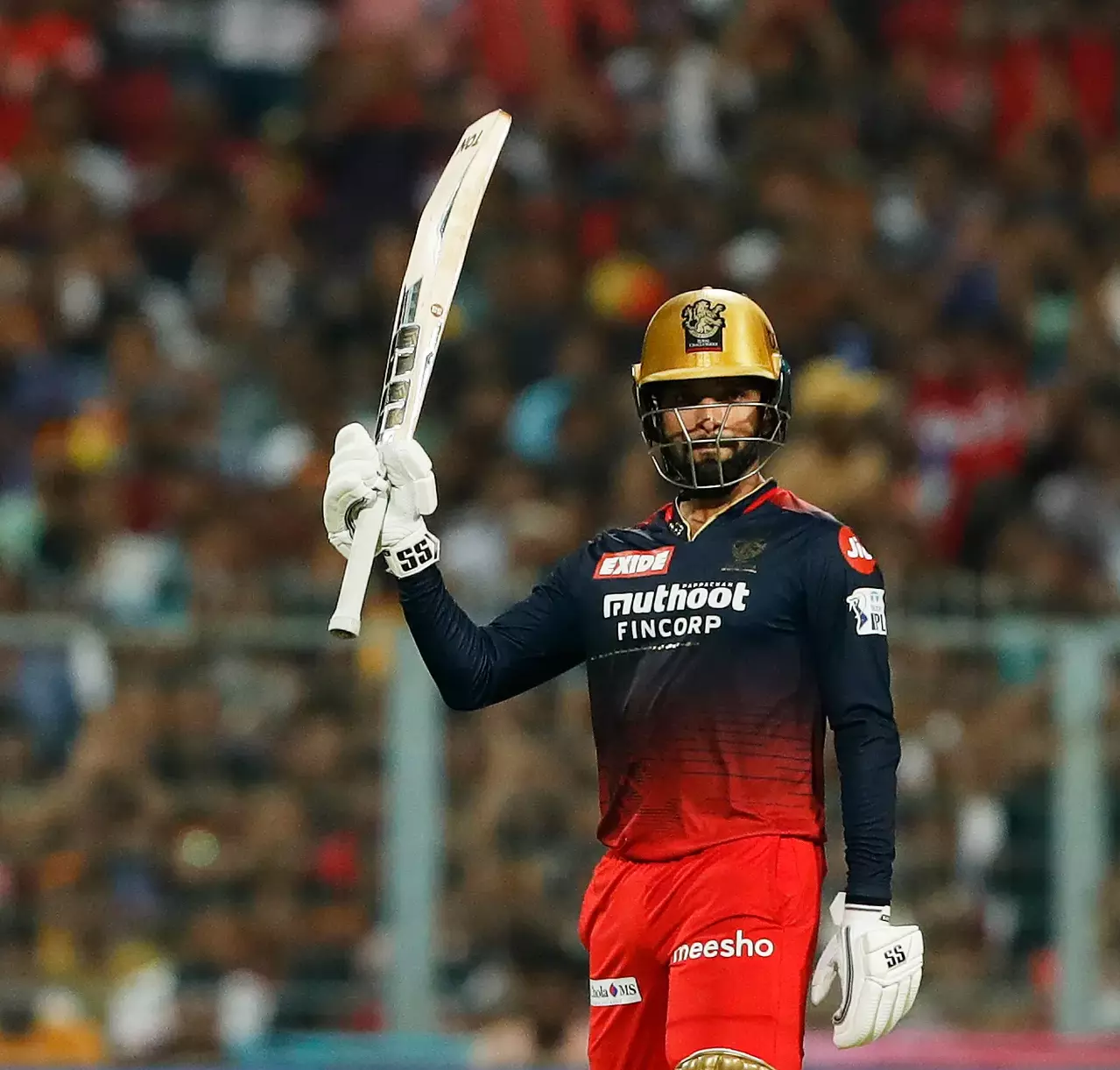 बेंगलोरका विश्व स्टार ब्याटर फाफ डु प्लेसिस गोल्डेन डक, विराट कोहली २५ र ग्लेन म्याक्सवेल ९ रनमा आउट हुँदा एक समय बेंगलोर समस्यामा परेको थियो । इडेन गार्डेनको ब्याटिङ सहयोगी पिचमा २ सय भन्दा कमको योगफल सुरक्षित मानिदैन । पहिलो ओभरको पाँचौं बलमा डु प्लेसिस मोहसिन खानको बलमा एज लागेर आउट भएपछि पाटिदार मैदान छिरेका थिए ।