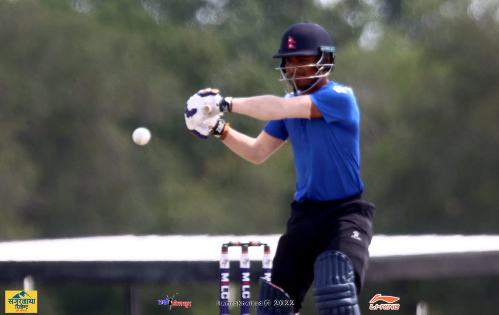 नेपालका कप्तान रोहित पौडेल ४८ बलमा ३ चौका र २ छक्कासहित ५६ रनमा अविजित छन् । कमजोर सुरुवात गरेको नेपाललाई चौथो विकेटका लागि रोहित र दीपेन्द्रसिंह ऐरीले ६० रनको साझेदारी गर्दै इनिङ उकासेका थिए । दीपेन्द्र स्पिनर हरमित सिंहको बलमा विकेटकिपर उस्मान वाफिकबाट २४ रनमा क्याच आउट भए । दीपेन्द्रले ३५ बलमा ३ चौका र १ छक्का प्रहार गरे ।