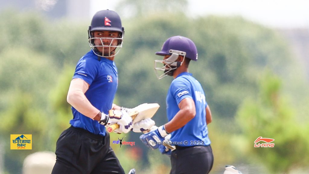 दोस्रो विकेटका लागि देव खनाल र सुनिल धमलाले ३४ रनको साझेदारी गरे । धमला मोहम्मद इलायसको नवौं ओभरको तेस्रो बलमा धमला एज लागेर विकेटकिपर उस्मान राफिकबाट क्याच भए । धमलाले १६ बलमा १ चौकासहित १३ रन जोडे । यसै ओभरको अन्तिम बलमा कभर डाइभ सट खेल्न खोजेका देव खनाल फस्ट स्लिपमा राजाबाट १९ रनमा क्याच भए । ३१ बल खेलेका देवले ४ चौका प्रहार गरे ।