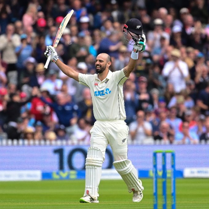 डर्याल मिचेल १ सय ५२ बलमा ९ चौकासहित ५६ रनमा आउट भए । टम लाथम ७६, केन विलियम्सन ४८ र डेभन कन्वे ११ रनमा आउट भए । इंग्ल्यान्डका स्पिनर ज्याक लेचले पाँच र तीव्र गतिका बलर म्याथ्यु पट्सले तीन विकेट लिए ।