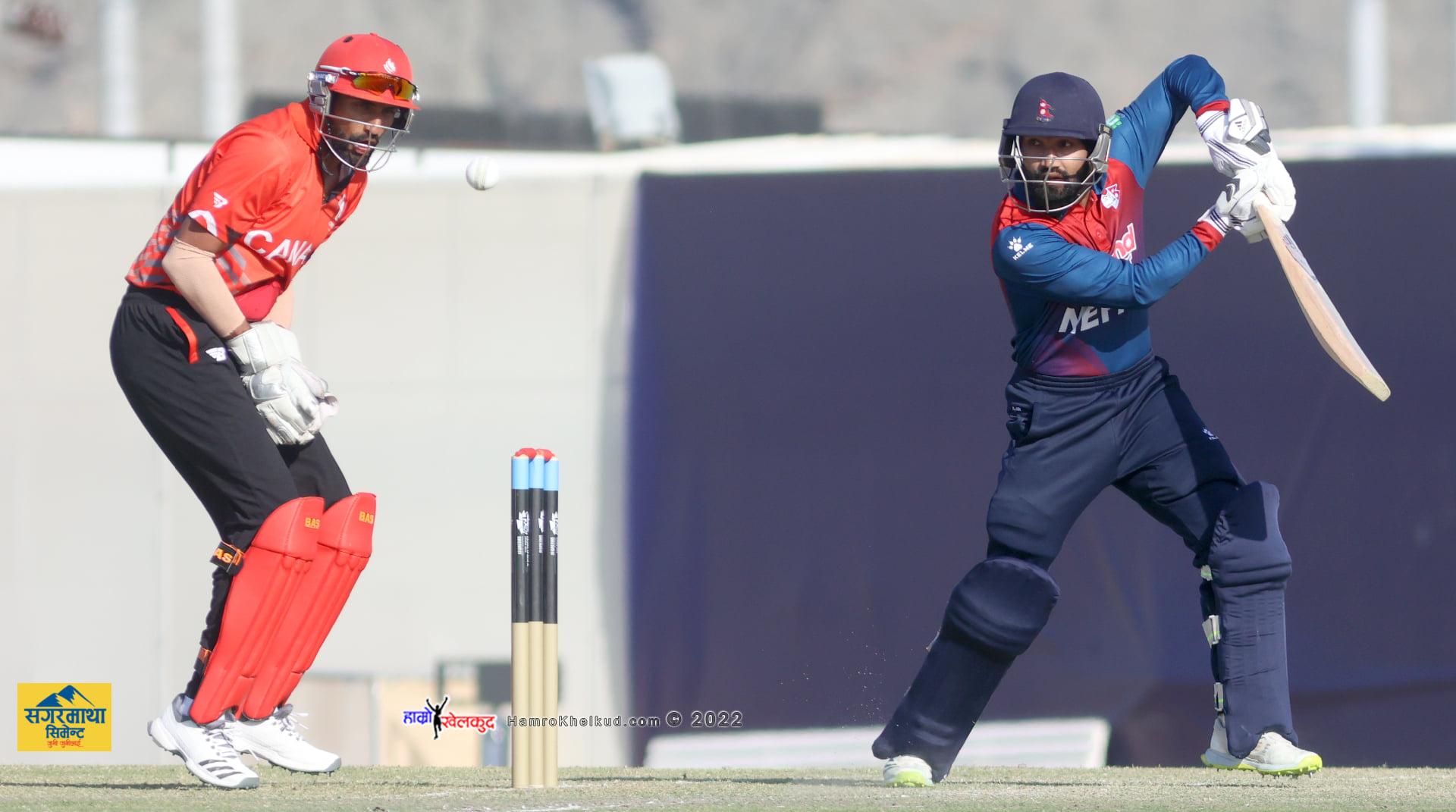 रोहित पौडेल ६, दीपेन्द्रसिंह ऐरी गोल्डेन डक, आरिफ शेख डक, बसिर अहमद ४१ बलमा १३ र विनोद भण्डारी २३ बलमा १ छक्कासहित १३ रनमा आउट भए । आदिल अन्सारी १३ र सन्दीप लामिछाने ११ रनमा आउट भए । करण केसी पाँच रनमा अविजित रहे । क्यानाडाका अमर खालिद, सलमान नजर, रोमेल शहजाद, साद विन जाफर र हर्ष ठकरले दुई दुई विकेट लिए ।
