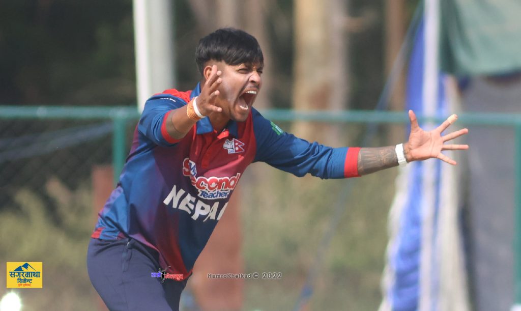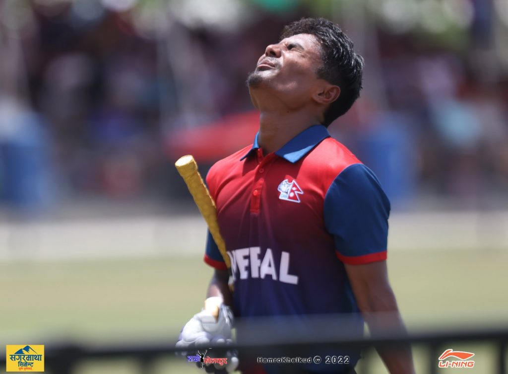 मार्क वाट्ले नै आरिफ शेखलाई २१ औं ओभरको तेस्रो बलमा कलुमबाट शून्यमा क्याच गराएपछि नेपाल संकटमा परेको थियो । दीपेन्द्र स्पिनर हम्जा ताहिरको बलमा एज लागेर विकेटकिपरबाट ७ रनमा क्याच आउट भए ।