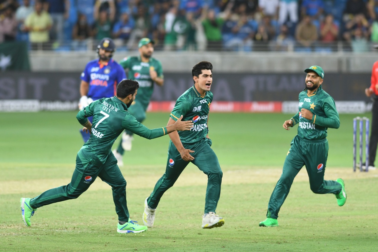 नवाजकै दशौं ओभरको पहिलो बलमा विराट कोहली लङअफमा इफ्तिखरबाट ३५ रनमा क्याच आउट भए । कोहलीले ३४ बलमा ३ चौका र १ छक्का प्रहार गरे । १५ औं ओभरको दोस्रो बलमा नसिम शाहले सूर्यकुमार यादवलाई १८ रनमा बोल्ड आउट गरे ।