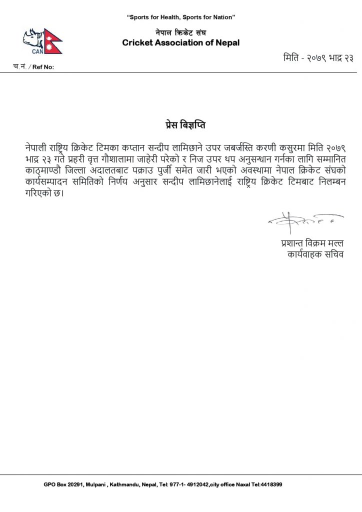 सन्दीपविरुद्ध उजुरी परेको सार्वजनिक भएको दुईदिनपछि काठमाडौं जिल्ला अदालतबाट पक्राउ पुर्जी समेत जारी भएको अवस्थामा क्यानको कार्यसम्पादन समितिको निर्णयले सन्दीपलाई निलम्बन गरेको कार्यवाहक सचिव प्रशान्त विक्रम मल्लले जानकारी दिए ।