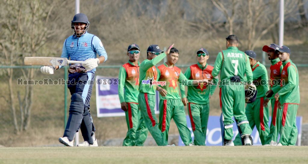 आर्मी ४ खेलमा २ मा जित र २ खेलमा अंक बाँड्दै ६ अंक जोडेर दोस्रो स्थानमा छ । आर्मीले कर्णाली र गण्डकीसँग अंक बाँडेको थियो । आर्मीले मधेश प्रदेशलाई ६ विकेटले हराएको थियो । आर्मीले लुम्बिनीलाई ९ विकेटले हराएको थियो । आर्मीले अन्तिम खेलमा बुधबार टियु मैदानमा खेल्नेछ ।