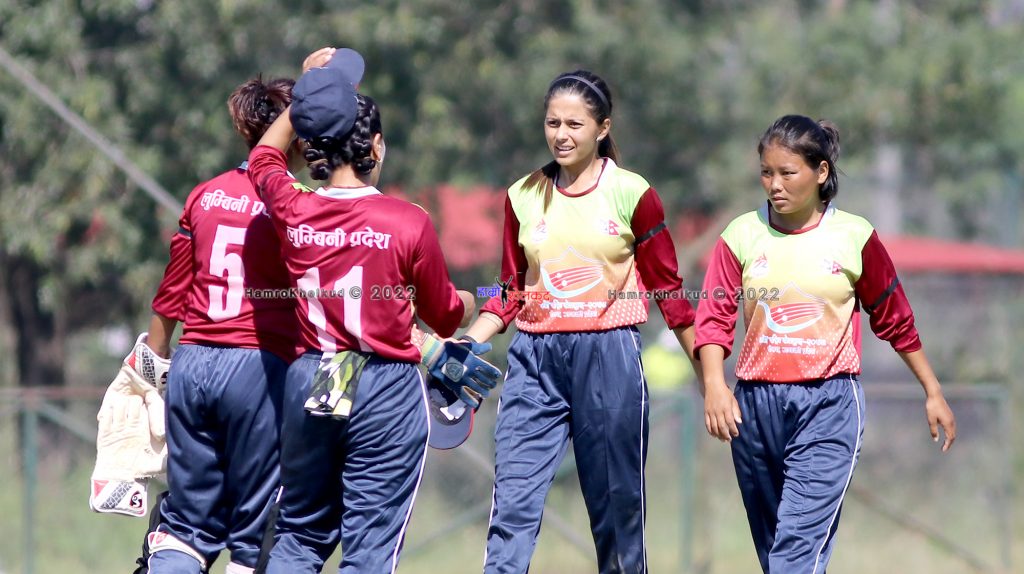 रोमा थापा १३ बल खेल्दै १२ रनमा अविजित रहिन् । लुम्बिनी प्रदेशकी कृतिका मरासिनीले ४ ओभरमा २० रन खर्चेर २ विकेट लिइन् । मनिषा रानाले ४ ओभरमा २५ रन खर्चेर १ विकेट लिइन् ।