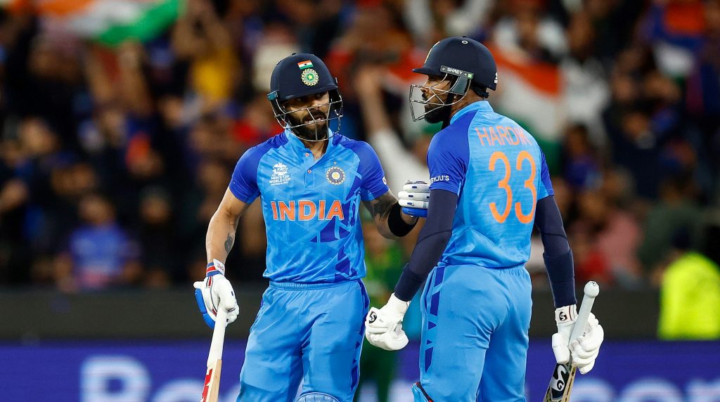 भारतका लागि विराट कोहलीले ५३ बलमा ६ चौका र ४ छक्कासहित ८२ रनमा अविजित रहँदै अविश्वसनयि जित दिलाए । एक समय ३१-४ को स्थितिमा रहेको भारतलाई हार्दिक पान्ड्या र कोहलीले शतकीय साझदारी गर्दै उकासेका थिए । कोहलीले सुरुवातमा संयमित ब्याटिङ गरेपनि अन्त्यमा भने विष्फोटक ब्याटिङ गर्दै जितसम्म डोर्याए ।