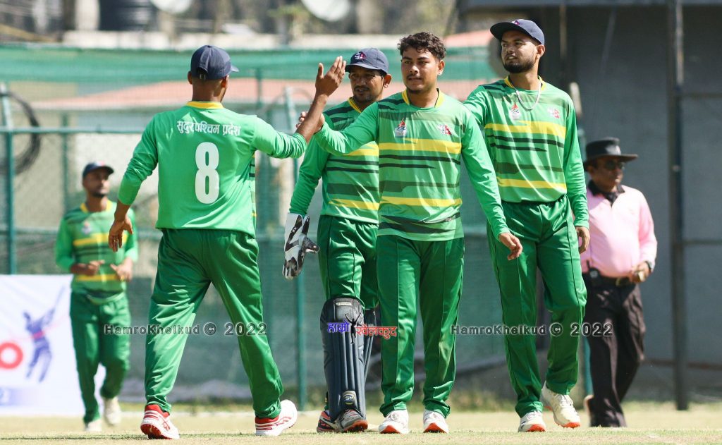 सुदूरपश्चिम प्रदेशले १० ओभरमा १ मेडनसहित २३ रन खर्चेर २ विकेट लिए । नारायण जोशीले १० ओभरमा २ मेडनसहित ३३ रन खर्चेर २ विकेट लिए । कैलाश ऐरले ८ ओभरमा ४० रन खर्चेर २ विकेट लिए । नरेन्द्र साउदले एक विकेट लिए ।