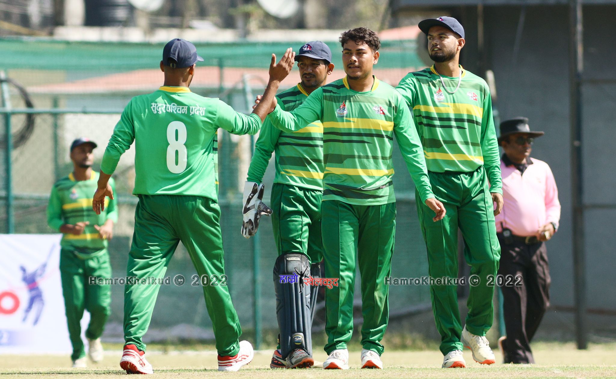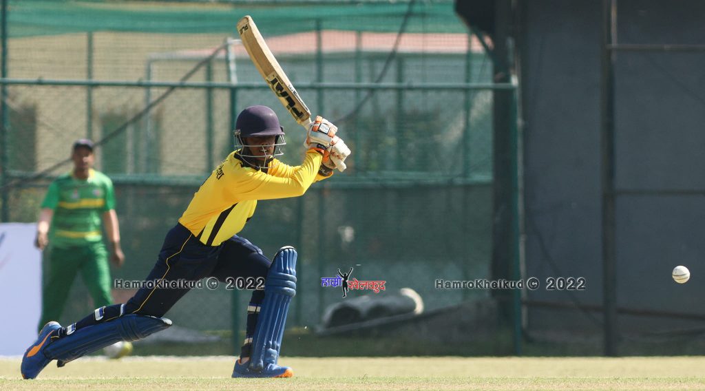 पहिलो विकेटका लागि अर्जुन र समिरले २३.१ ओभरमा ६८ रनको साझेदारी गरेका थिए । त्यसपछि विधान श्रेष्ठ र अभिषेक बस्नेत २५–२५ रनमा आउट भए । विधानले ३४ बलमा ५ चौका र अभिषेकले ३४ बलमा २ चौका प्रहार गरे । सन्दीप क्षेत्री २२ बलमा १ चौका र २ छक्कासहित १९ रनमा आउट भए । कमल परियार र विपिन खत्रीले १३–१३ रन बनाए ।