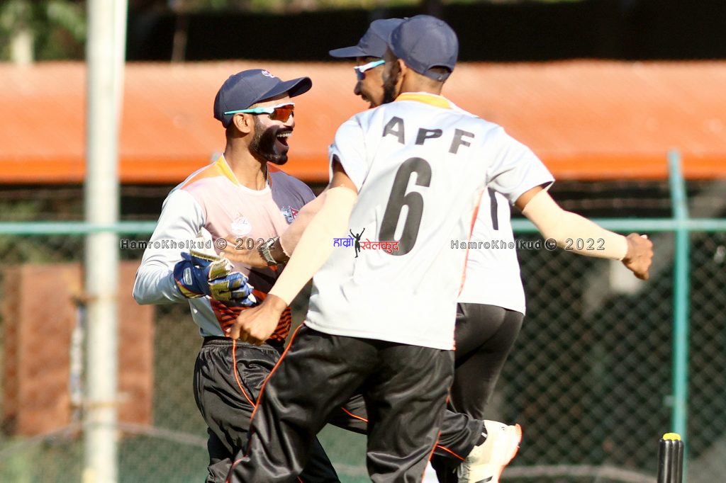 जितको लागि ६८ रनको विजयी लक्ष्य पछ्याएको एपिएफ ११.२ ओभरमा कुनै विकेट नगुमाई पूरा गरेको छ । एपिएफको जितमा आसिफ शेख ३२ बलमा ७ चौका र १ छक्कासहित ४२ रनमा अविजित रहे । प्रदीप ऐरी ३६ बलमा १ चौका र २ छक्कासहित २५ रन बनाए ।