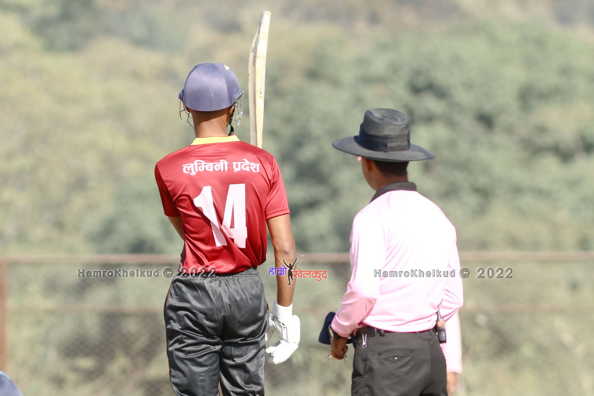 लुम्बिनीका अनिल खरेलले १० ओभरमा ३ मेडनसहित ३० रन खर्चेर ४ विकेट लिए । विशाल विक्रम केसीले ३.१ ओभरमा १ मेडनसहित ५ रन खर्चेर २ विकेट लिए ।