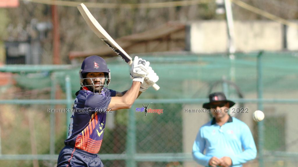 तीव्र गतिका बलर करण केसीले ओपनर आकाश त्रिपाठीलाई पहिलो ओभरको पाँचौं बलमा शून्यमा विकेटकिपर दीलिप नाथबाट क्याच गराए । दोस्रो विकेटका लागि प्रज्वल थापा र देव खनालले ६० रनको साझेदारी गरेका थिए ।