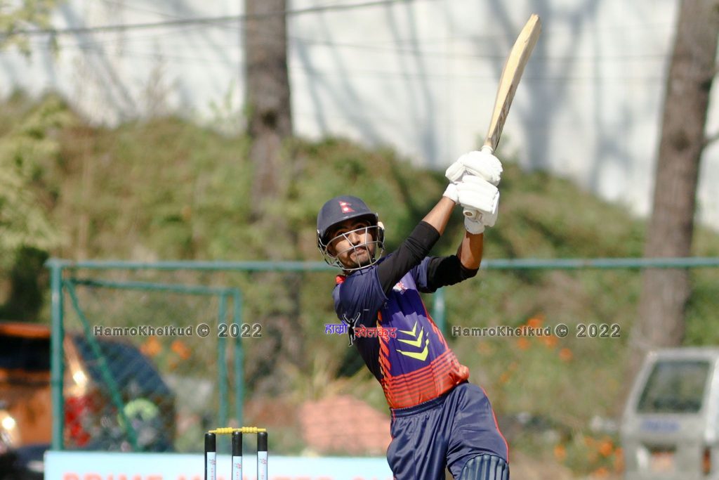 ओपनर सुनिल धमलाले आफ्नो उच्च लयलाई निरन्तरता दिँदै पावर प्लेमा २६ बलमा ४ चौका र २ छक्कासहित ३६ रन जोड्दै आक्रामक सुरुवात दिलाएका थिए ।