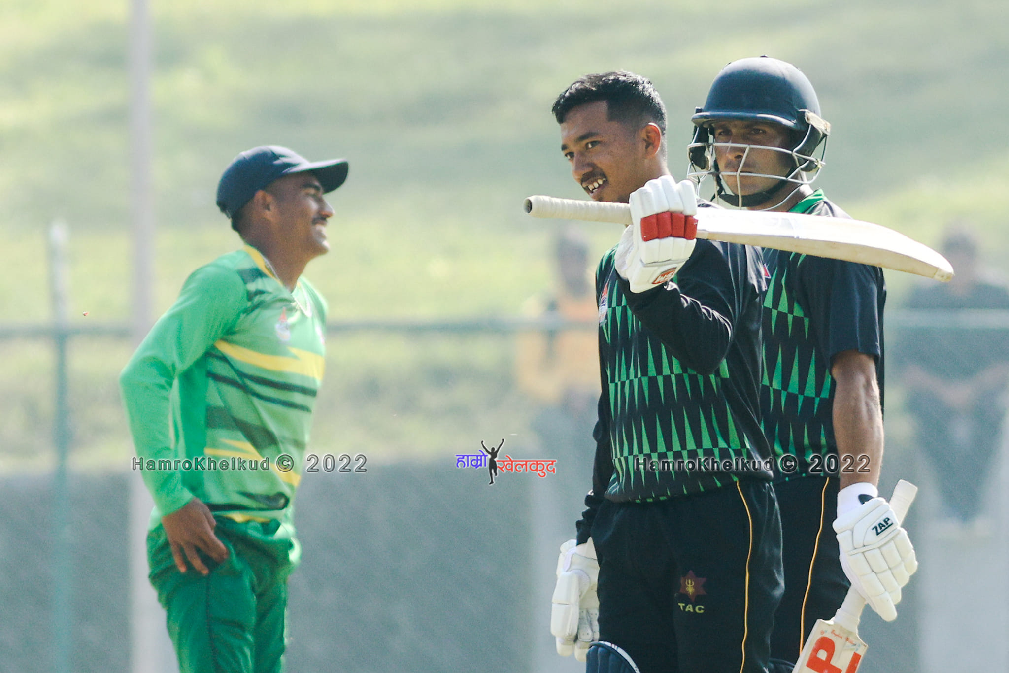 भण्डारीले १८ बलमा ३ चौका र रावलले २३ बलमा १ चौका हाने । कप्तान राजु रिजाल २, विरेन्द्र नाथ शून्य, मिलन बोहरा १२ र बसन्त कार्कीले १४ रन बनाए । बसन्त कार्कीले १९ बलमा ३ चौका प्रहार गरे । नारायण जोशीले ४२ बलमा १ चौकासहित १९ रन बनाए ।