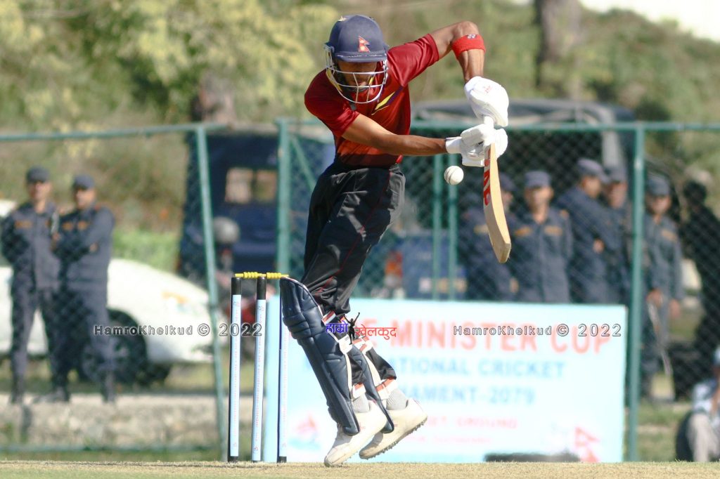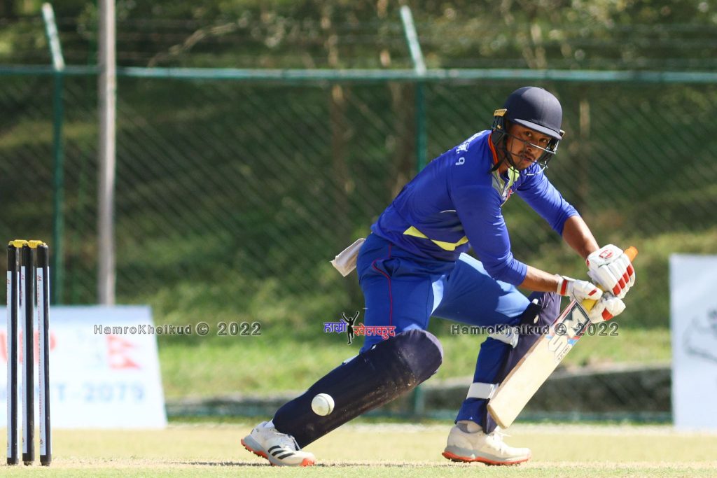 अंकित ४८ बलमा १० चौकासहित ५२ रनमा आउट भए । अंकित रन आउट भएका थिए । मुखिया ३७ बलमा १० चौकासहित ४६ रनमा आउट भए । विवेक आनन्द मेहता ७, मिनाश थापा शून्य, फिर्दोस अन्सारी १६, सोनु अन्सारी ३, श्रवण यादव १५ र सोनु मण्डल २० रनमा आउट भए । लुम्बिनी प्रदेशका दुर्गेश गुप्ता, बसिर अहमद र देव खनालले दुई दुई विकेट लिए ।