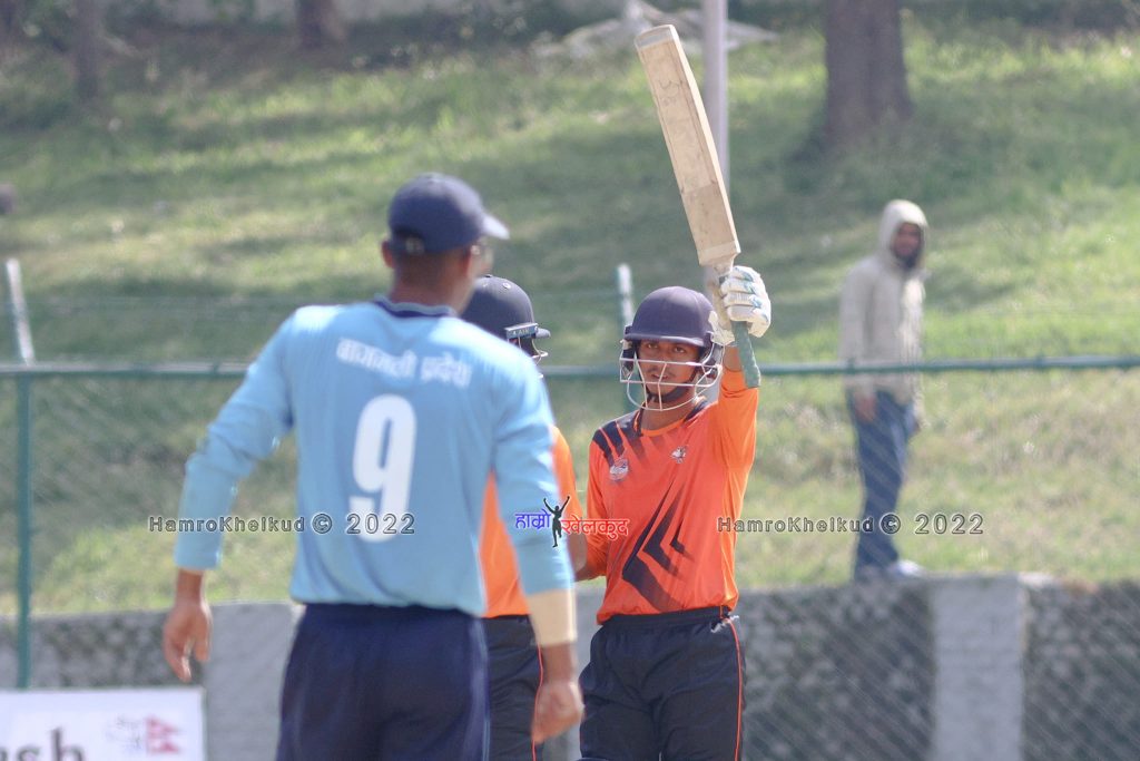 तीव्र गतिका बलर नन्दन यादवले आठौं ओभरको चौथो बलमा कप्तान हरिशंकर शाहलाई १३ रनमा बोल्ड गरे । उनले २२ बलमा ३ चौका प्रहार गरे । प्रतिश जि.सीले अर्का ओपनर सन्तोष कार्कीलाई २३ रनमा बोल्ड गरे । सन्तोषले ४८ बलमा ३ चौका हाने ।
