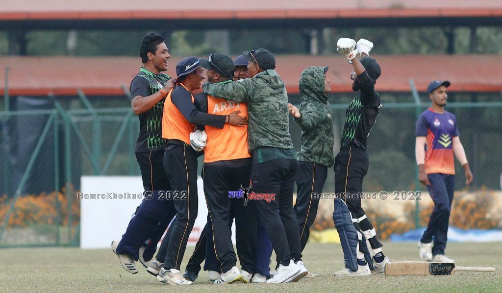 जितको लागि ३ सय ५ रनको विशाल विजयी लक्ष्य पछ्याएको आर्मीले ४९.५ ओभरमा ८ विकेट गुमाउँदै पूरा गर्यो । आर्मीलाई जितको लागि अन्तिम ६ बलमा ८ रन चाहिँएको थियो । राजेश पुलामी मगरले पहिलो बलमा रन लिएनन् । दोस्रो बलमा एज लागेर विकेटकिपरको साइडबाट चौका गएपछि जित नजिक पुगेको थियो ।