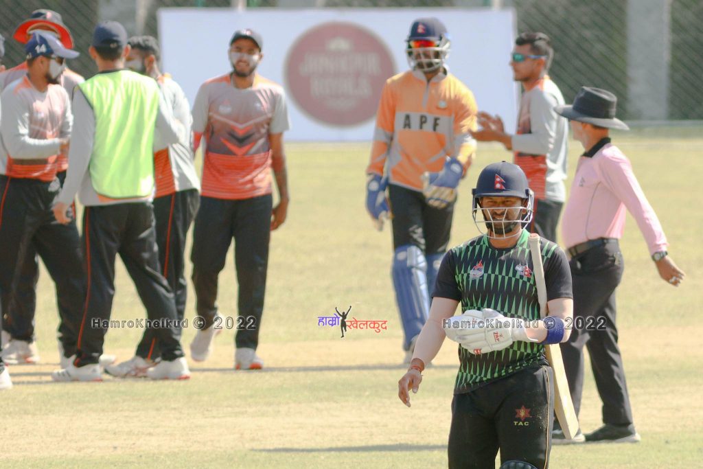 एपिएफका किशोर महतोले ४ ओभरमा १३ रन खर्चेर २ विकेट लिए । अमरसिंह राउटेला र मौसम ढकालले एक एक विकेट लिए ।