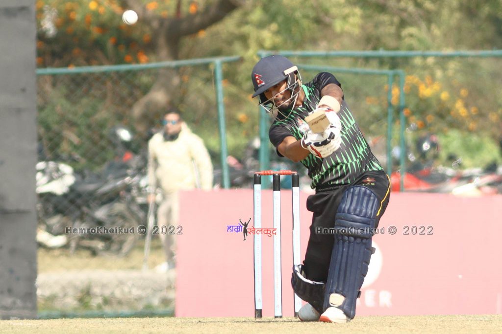 अमरसिंह राउटेलाको बलमा अर्जुन साउद कमलसिंह ऐरीबाट १३ रनमा आउट भए । अर्जुनले ३३ बल खेलेपनि बाउन्ड्री प्रहार गरे । हरि चौहान २५ बलमा १ चौका र १ छक्कासहित १५ रनमा रन आउट भए । लोकेश बमले हारेको थ्रो लागेपछि पेभेलिएन फर्केका थिए ।