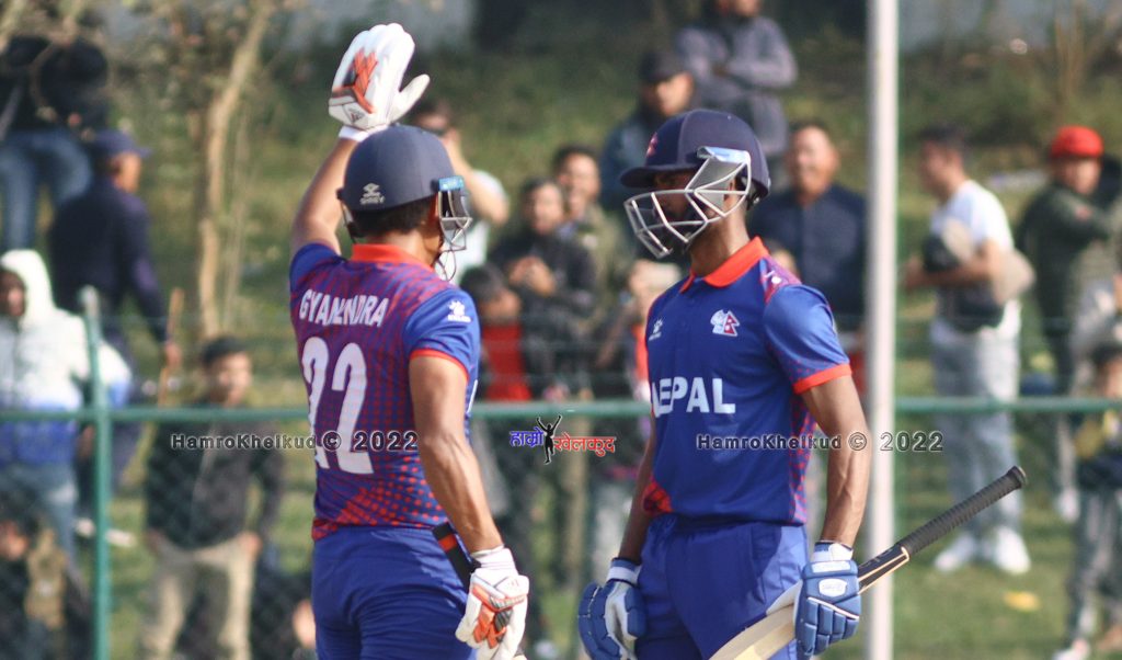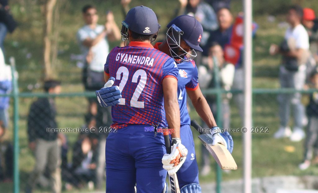 यी दुई ब्याटरले आफ्नो कीर्तिमान नै तोडेका हुन् । दोस्रो विकेटका लागि गतवर्ष ओमानविरुद्ध ज्ञानेन्द्र र आसिफले ९५ रनको साझेदारी गरेका थिए । ज्ञानेन्द्र मल्ल स्पिनर आयन खानको ३४ औं ओभरको पहिलो बलमा एलबीडब्लू आउट भए । कप्तान रोहित पौडेल १७ बलमा १ चौकासहित १० रनमा रन आउट भए ।