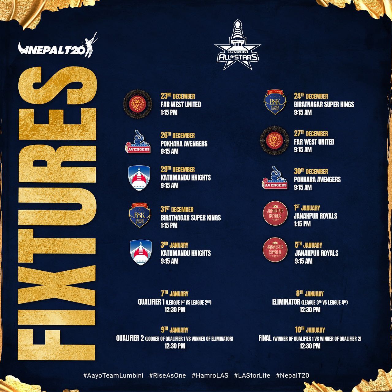नेपाल टि२० लिगमा काठमाडौं नाइट्स, पोखरा एभेन्जर्स, विराटनगर सुपर किंग्स, लुम्बिनी अल स्टार्स, जनकपुर रोयल्स र फार वेस्टर्न युनाइटेड छन् । लुम्बिनीले सबै टोलीसँग डबल राउन्ड रोविनको आधारमा प्रतिस्पर्धा गर्नेछ । शीर्ष चारमा रहन सके प्लेअफ खेल्नेछ । शीर्ष दुई टोलीबीच पहिलो क्वालिफायर हुनेछ । फाइनल १० जनवरीमा हुनेछ ।