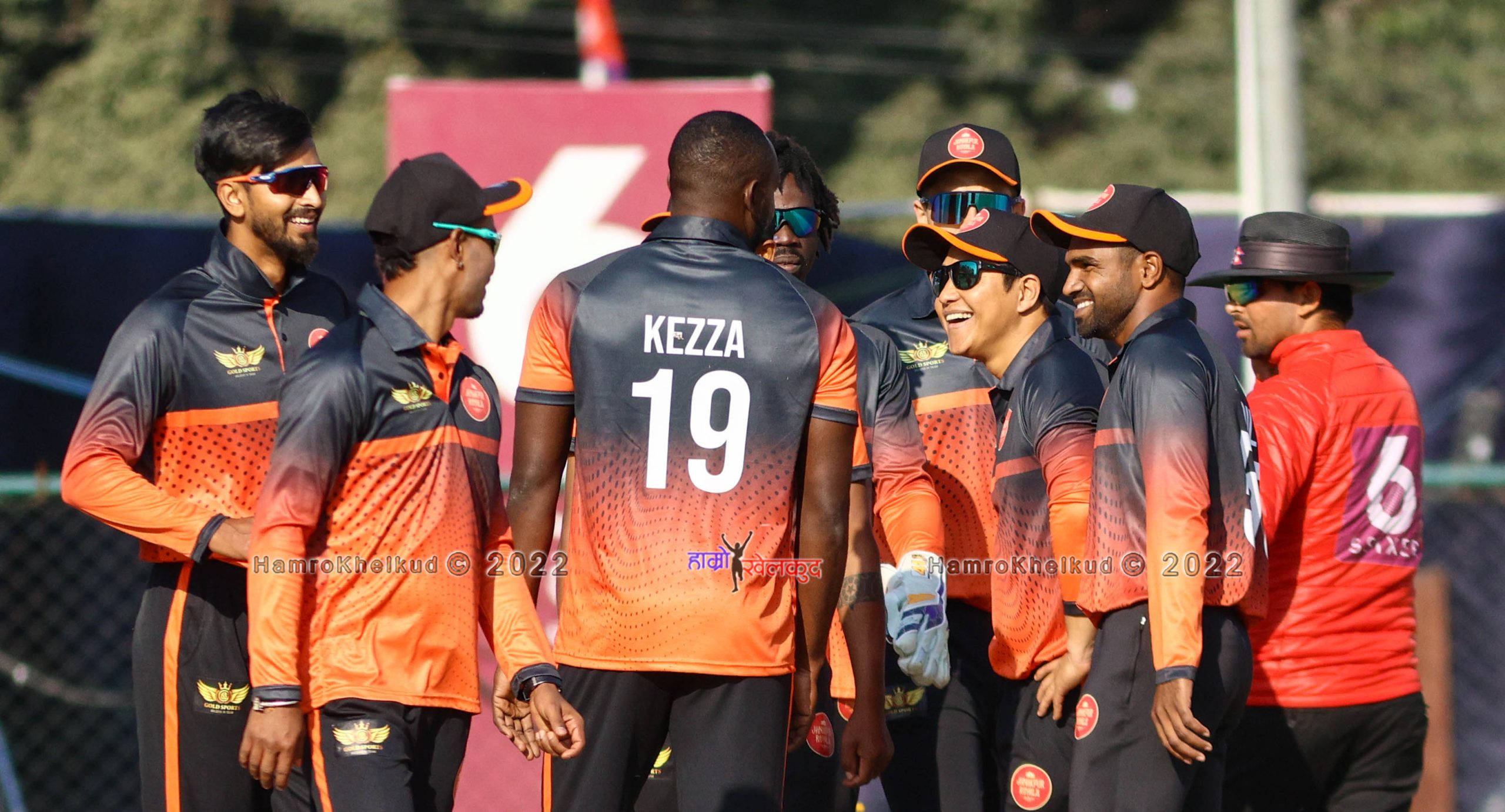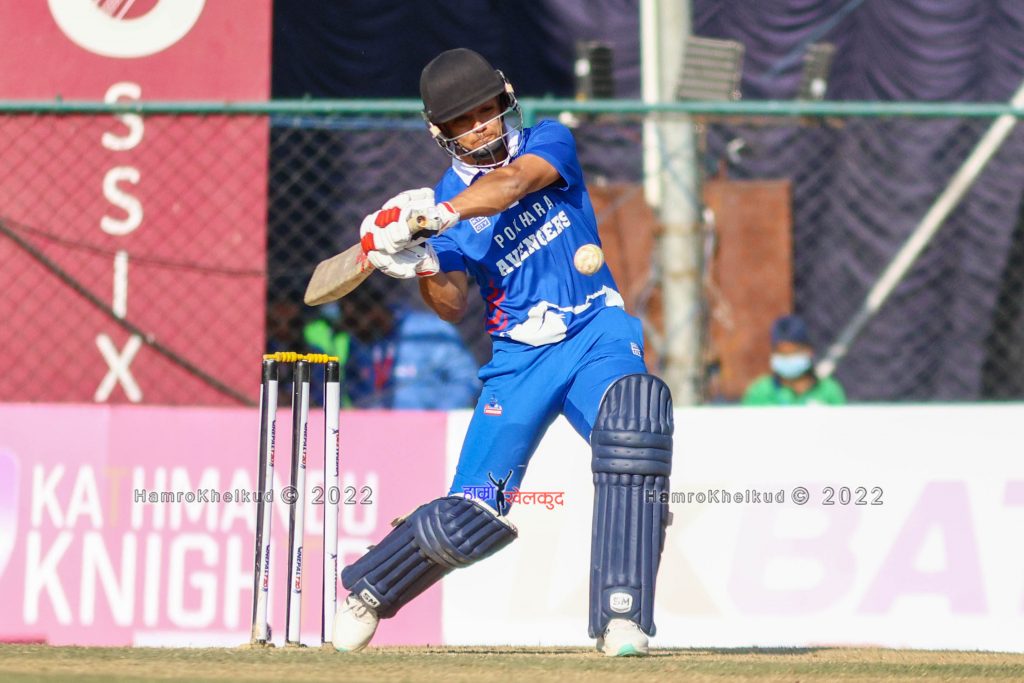 ललित नारायण राजवंशीको बलमा ठूलो सट खेल्ने धुनमा मिस हुँदा कप्तान शरद भेषावकर दुई रनमा बोल्ड भए । ललितले अभिमन्यु मिथुनलाई दुई रनमा कट एण्ड बोल्ड आउट गरे । केस्रिक विलियम्सनले आसिफ शेखलाई आउट बोल्ड गरेपछि पोखरा १११–९ को दयनीय अवस्थामा पुगेको थियो ।