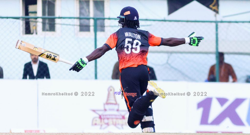 तेस्रो बलमा लङअनमा छक्का हानेपछि तीन बलमा मात्रै ६ रन चाहिँएको थियो । चौथो फुलटस बल वाल्टनले मिस गरे । पाँचौं बल स्टेटमा चौका हाने । अन्तिम बलमा दुई रन चाहिँदा प्वाइन्ट र थर्ड म्यानको बीचमा अमरसिंह राउटेला फिल्डिङमा चुक्दा दुई रन पूरा गर्दै रोमान्चक जित हात पारेको थियो ।