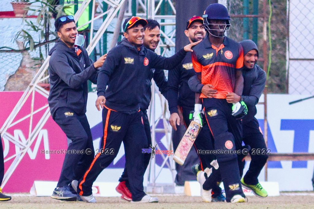 १८ औं ओभरमा नन्दन यादवले ९ रन मात्रै खर्चिएपछि अन्तिम दुई ओभरमा २७ रन चाहिँएको थियो । सिकन्दर राजालाई १९ औं ओभरमा आदिल आलमले एक छक्कासहित ११ रन मात्रै बटुले । विराटनगरका हुसेन तालत, नन्दन यादव र रिजन ढकालले एक एक विकेट लिए ।