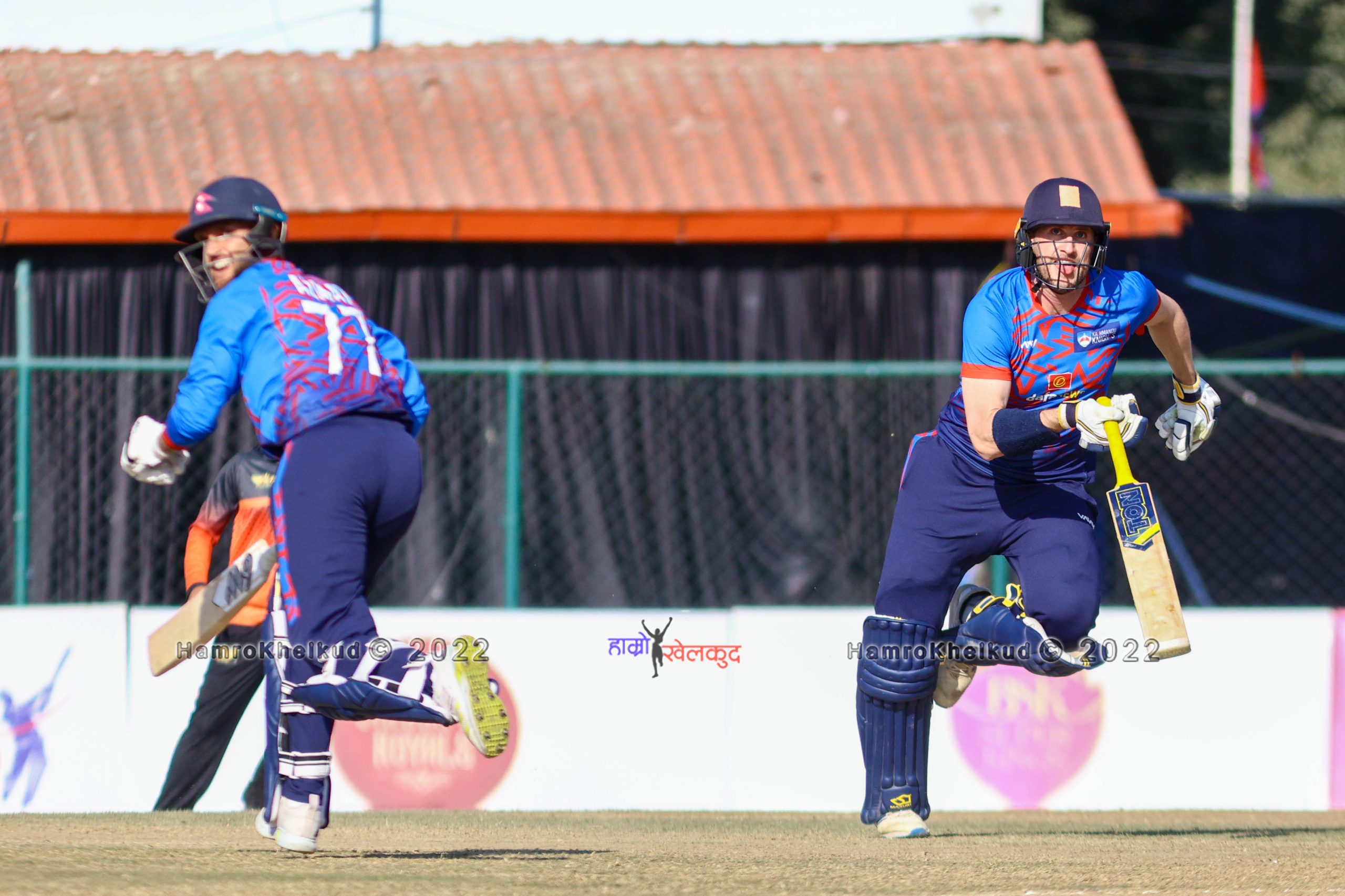ब्लेक जितेन्द्र मुखियाको अन्तिम ओभरको दोस्रो बलमा लङअफमा सन्दीप जोराबाट क्याच आउट भए । ओपनर विरनदीप सिंह ३४ बलमा ७ चौका र १ छक्कासहित ४९ रनमा आउट भए ।