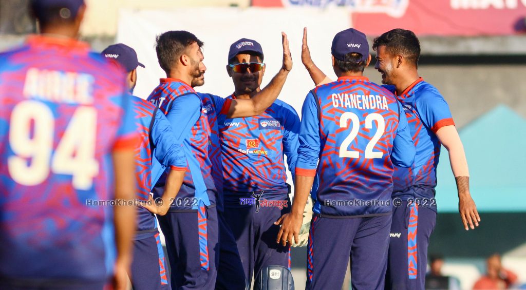 मोहम्मद आदिलको बलमा ज्ञानेन्द्र मल्ल कभरमा टे«भन ग्रिफिकबाट दुई रनमा उत्कृष्ट क्याच आउट भए । दोस्रो विकेटका लागि विरनदीप र ब्लेकले ६२ रनको साझेदारी गरे । तल्लोक्रमका आजमतुल्लाह ओमरजाई १५ बलमा १ चौका र ४ छक्कासहित ४३ रनमा अविजित रहे । नेपाल टि२० लिगमा २ सय माथि रन बनाउने पहिलो टोली काठमाडौं बन्यो ।