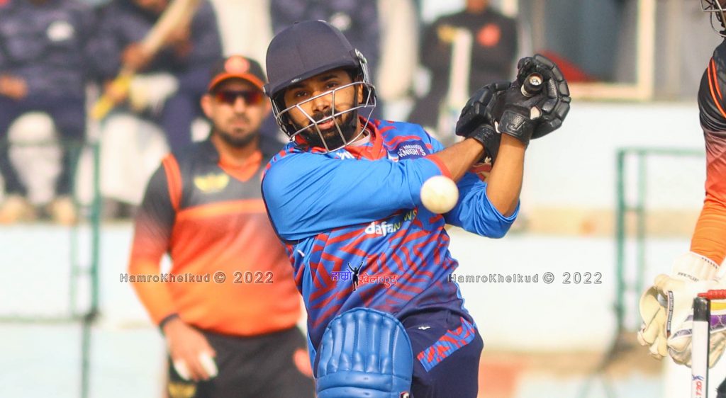 कप्तान ट्रेभन ग्रिफिकको बलमा सुनम सन्दीप जोराबाट क्याच आउट भए । सुनमको यो नेपाल टि२० लिगको पहिलो अर्धशतक हो । लोकेश बम ७ र आज्मातुल्लाह ओमारजाईले १० रन बनाए । जनकपुरका जितेन्द्र मुखियाले ४ ओभरमा ३८ रन खर्चेर ३ विकेट लिए । शराफुद्दिन अशरफ र ट्रेभन ग्रिफिथले एक एक विकेट लिए ।