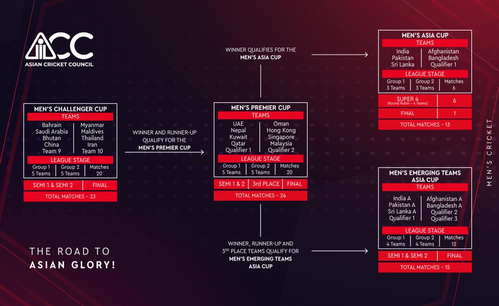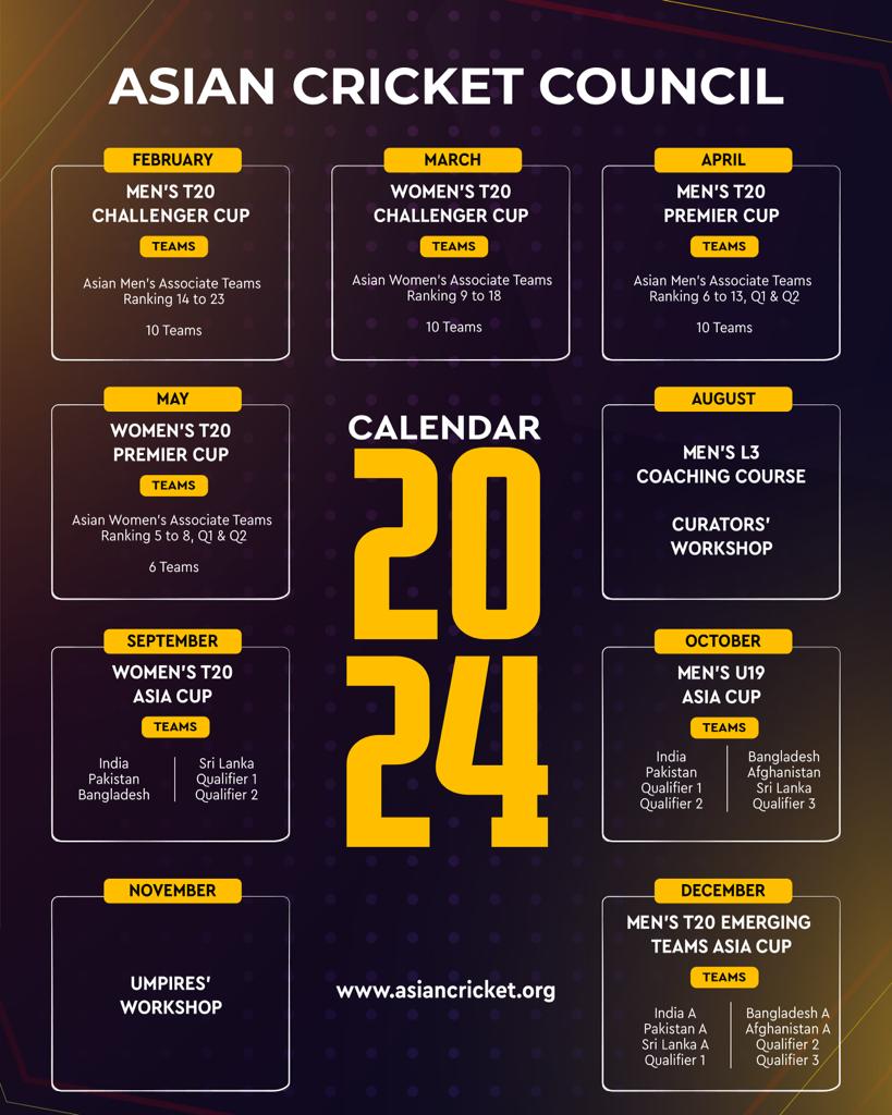 यू–१९ एसिया कपमा भारत, पाकिस्तान, क्वालिफायर एक र टु रहनेछन् । समूह बी मा बंगलादेश, अफगानिस्तान, श्रीलंका र क्वालिफायर थ्रीको टोली हुनेछ । पहिलो पटक २०२४ को फेब्रुअरीमा टि२० च्यालेन्जर कप हुनेछ । जसमा वरियता १४ देखि २३ सम्मका एसोसियट टोली हुनेछन् । २०२४ को अप्रिलमा टि२० प्रिमियर कप हुनेछ । प्रिमियर कपमा वरियता ६ देखि १३, तथा क्वालिफायरबाट आउने दुई टोली हुनेछन् । अन्य थुप्रै प्रतियोगिता हुनेछन् ।
