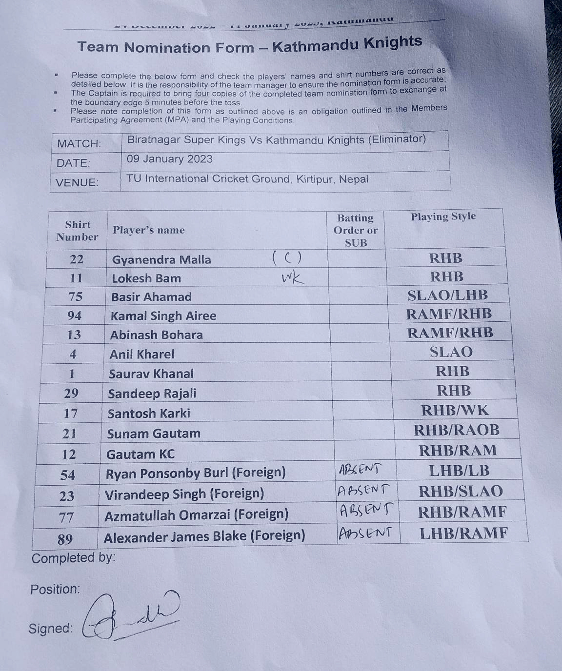 प्लेइङ ११ मा नपरेपछि खेलाडी सुचिमा उल्लेख गरेअनुसार बेन्चमा बस्ने खेलाडीले मात्र मैदानभित्र खेलेका अन्य खेलाडीलाई पानी र खानी कुरा पुर्याउनु पर्ने हुन्छ । तर नेपाल टि२० लिगमा काठमाडौं नाइट्सले सोमबार एलिमिनेटर खेलमा विराटनगर सुपर किंग्ससँग खेल्नु अघिल्लो दिननै प्लेइङ-११ पक्का थियो । किनभने विदेशी खेलाडी सबै फर्किएपछि टोलीमा बाँकी ११ नेपाली मात्रै थिए ।