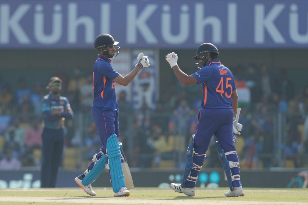 भारतलाई ओपनर शुभमन गिल र कप्तान रोहित शर्माले उत्कृष्ट सुरुवात दिलाएका थिए । पहिलो विकेटका लागि गिल र रोहितले मात्रै १९.४ ओभरमा १ सय ४३ रनको आक्रामक शतकीय साझेदारी गरेका थिए । रोहित ६७ बलमा ९ चौका र ३ छक्कासहित ८३ रनमा आउट भए । रोहित तीव्र गतिका बलर दिलशान मदुशंकाको बलमा बोल्ड भए ।